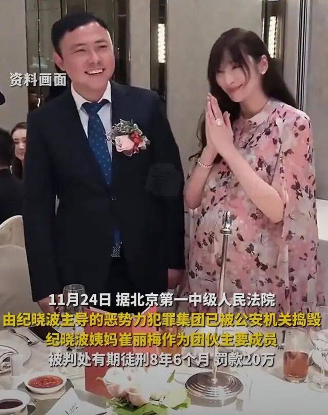 2023年11月25日,据红网消息,11月24日,北京市第一中级人民法院发布通报称,以吴佩慈未婚夫纪晓波为首要分子的恶势力犯罪集团已被公安机关打掉。纪晓波姨妈崔丽梅作为犯罪集团的主要成员,因开设赌场罪被判处有期徒刑8年6个月,并处罚金人民币20万元。
